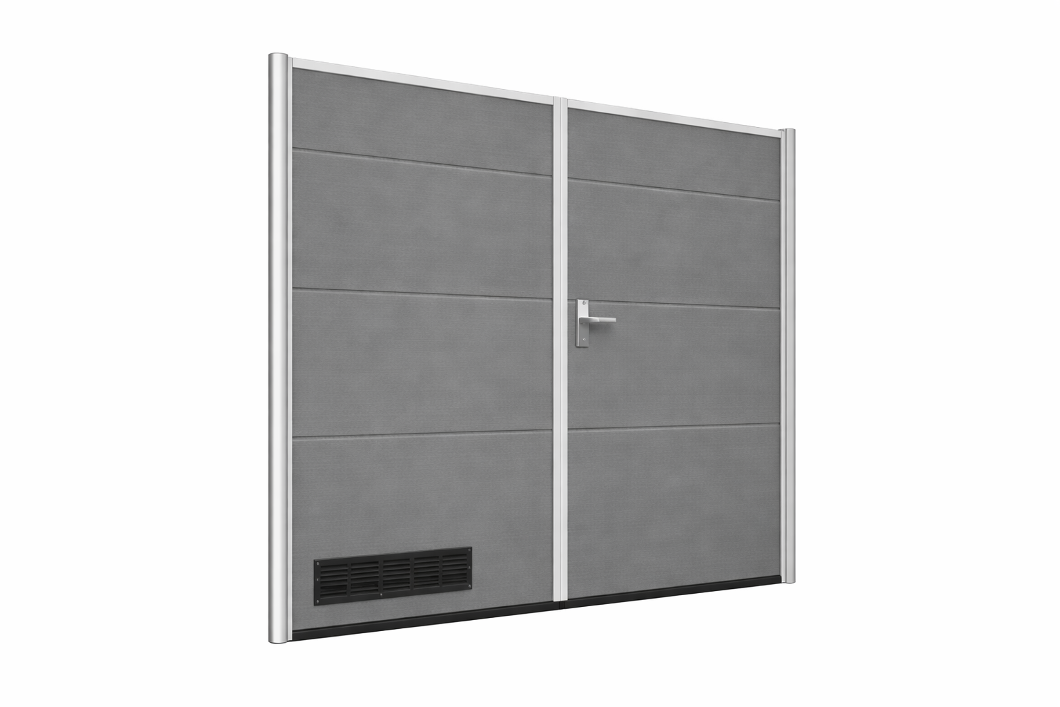 Konstrukcja oparta jest na aluminiowej ramie wzmacnianej stalą ocynkowaną, co zapewnia wysoką trwałość i odporność na korozję. Brama posiada symetryczny podział skrzydeł i otwiera się na zewnątrz. Prawe skrzydło wyposażone jest w zamek z wkładką, klamkę oraz dwa rygle (górny i dolny).