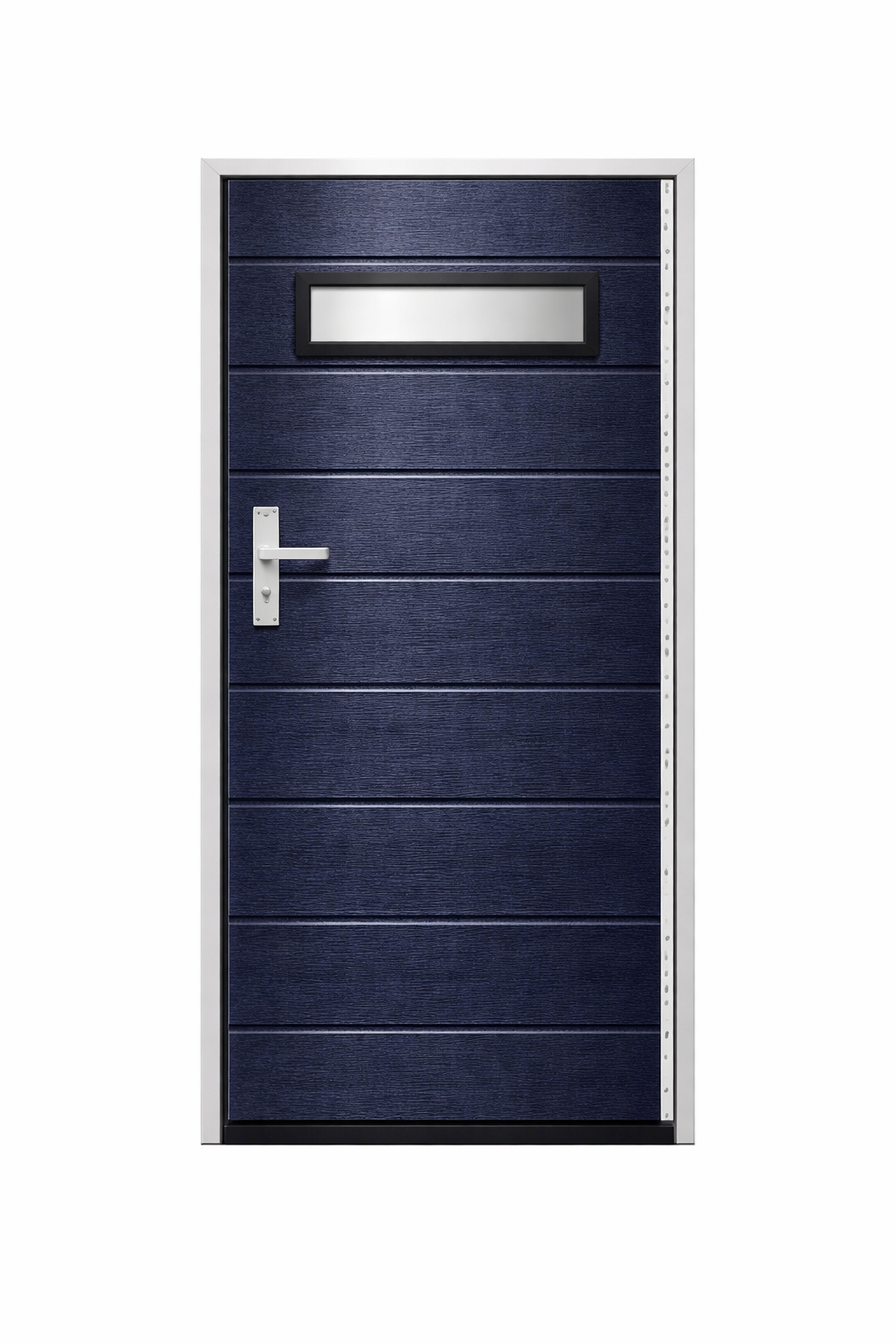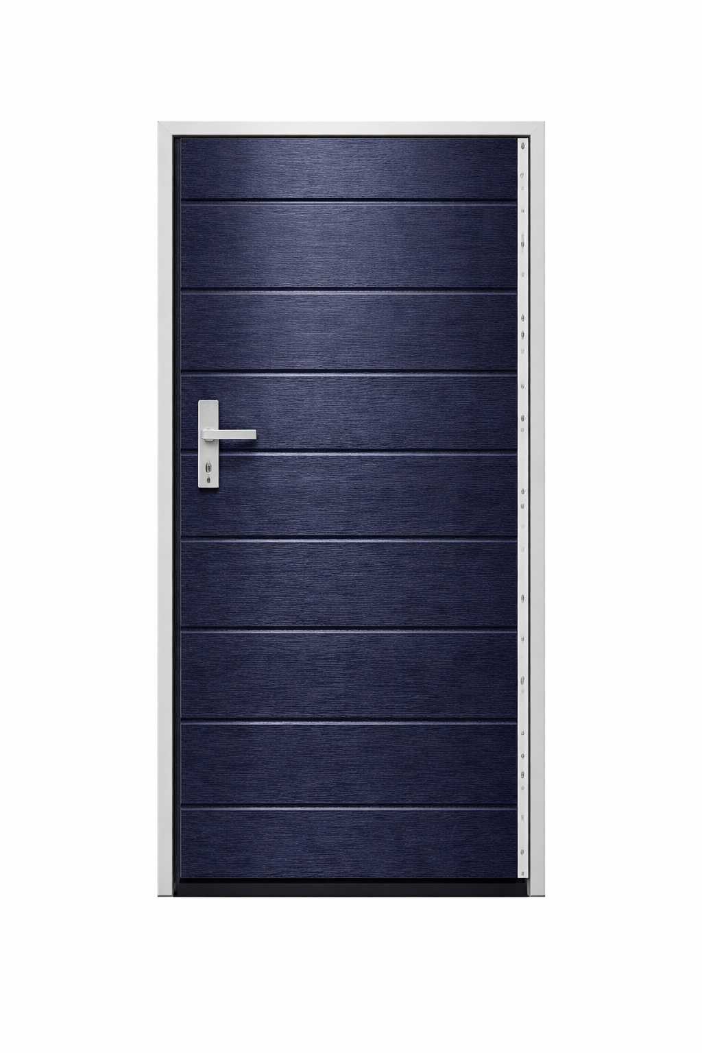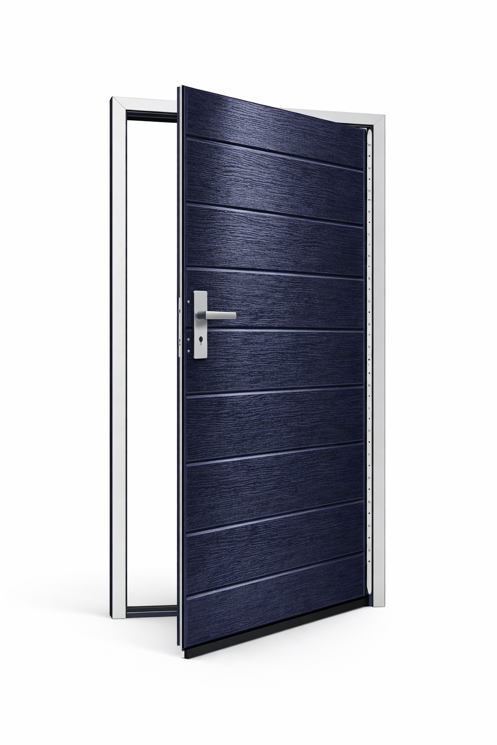 Skrzydło drzwiowe posiada wąskie przetłoczenia poziome rozmieszczone co około 10 cm, które nadają całości nowoczesny charakter oraz zwiększają sztywność konstrukcji.