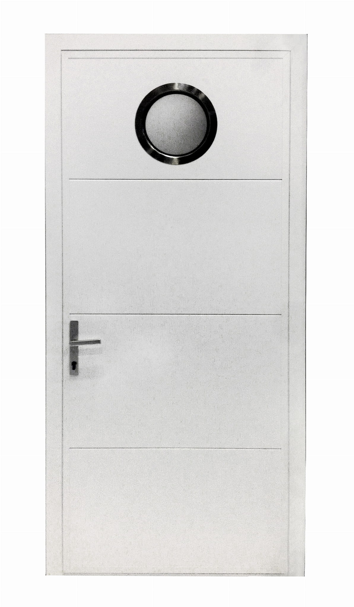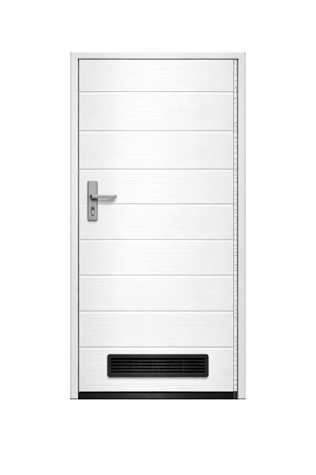 Skrzydło drzwiowe posiada wąskie przetłoczenia poziome rozmieszczone co około 10 cm, które nadają całości nowoczesny charakter oraz zwiększają sztywność konstrukcji.