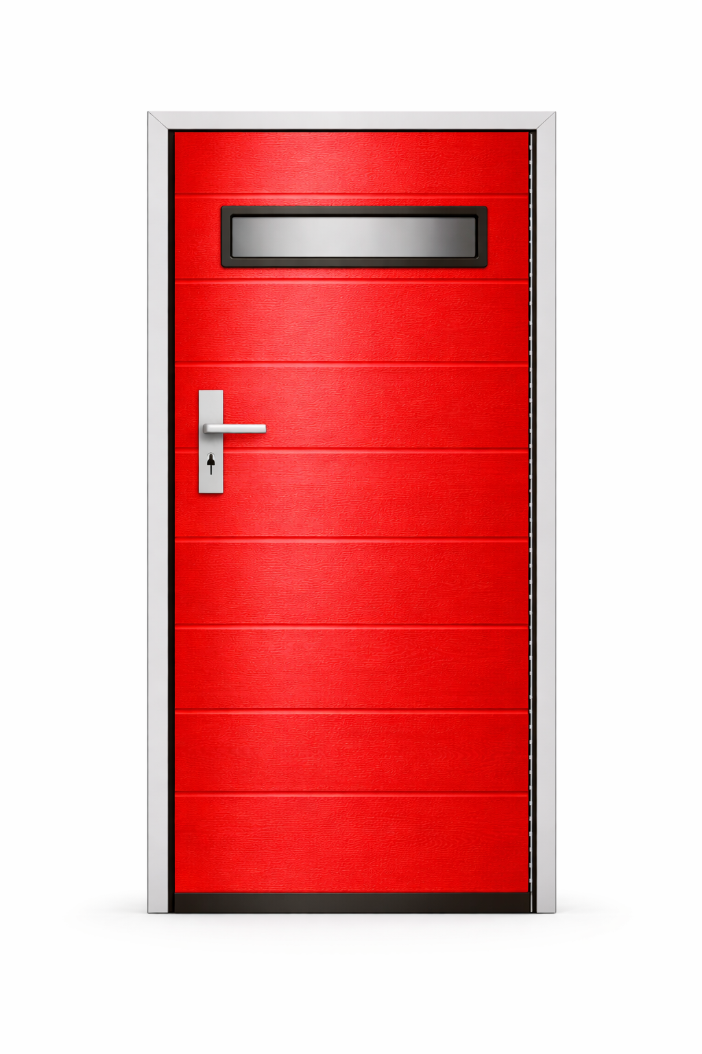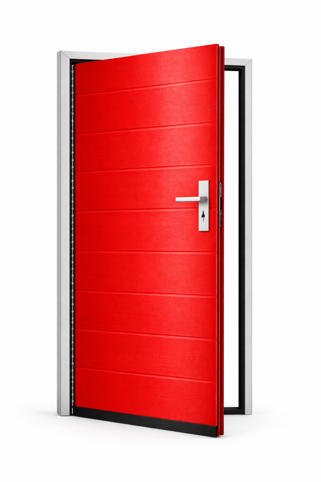Skrzydło drzwiowe posiada wąskie przetłoczenia poziome rozmieszczone co około 10 cm, które nadają całości nowoczesny charakter oraz zwiększają sztywność konstrukcji.