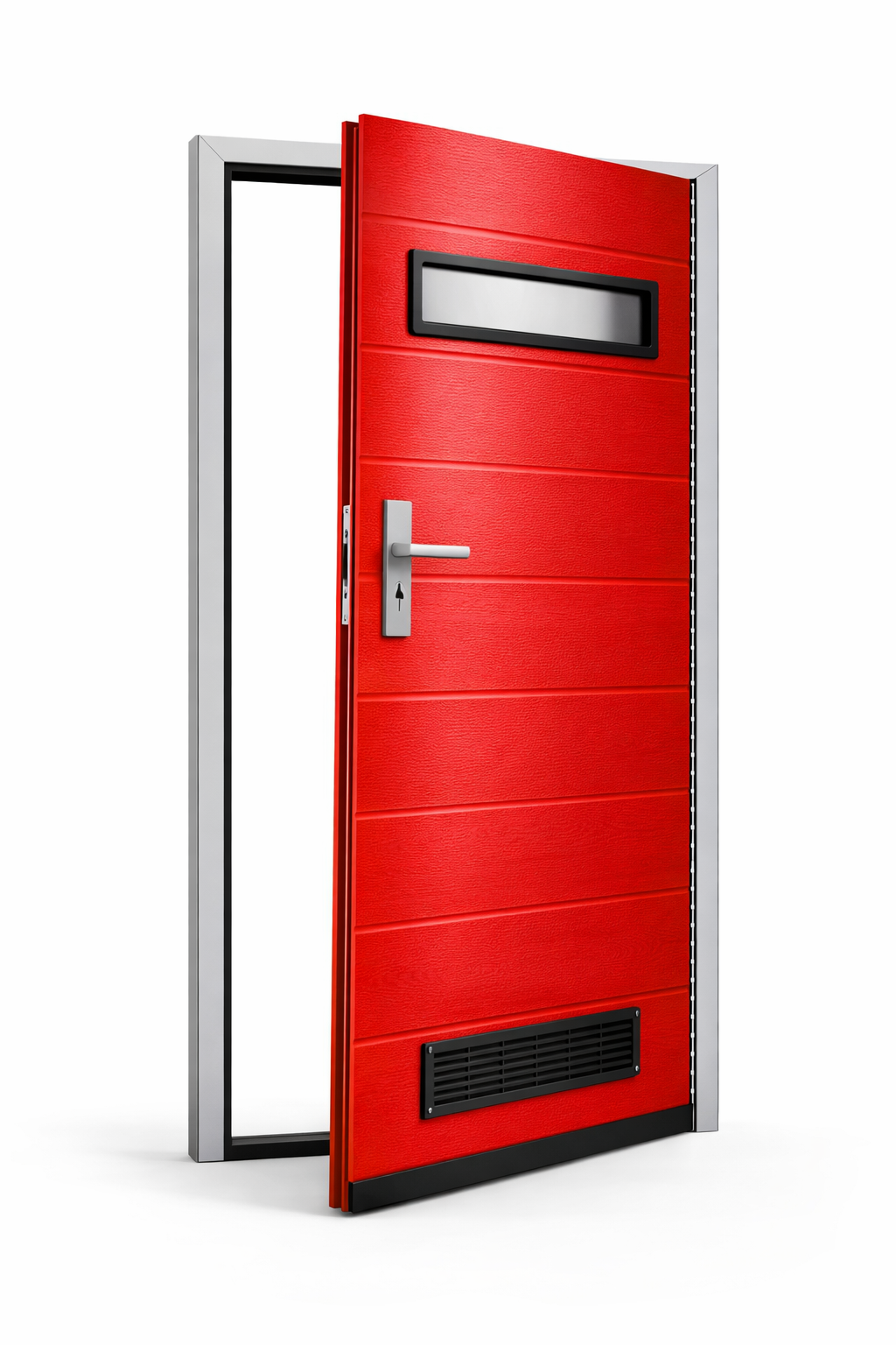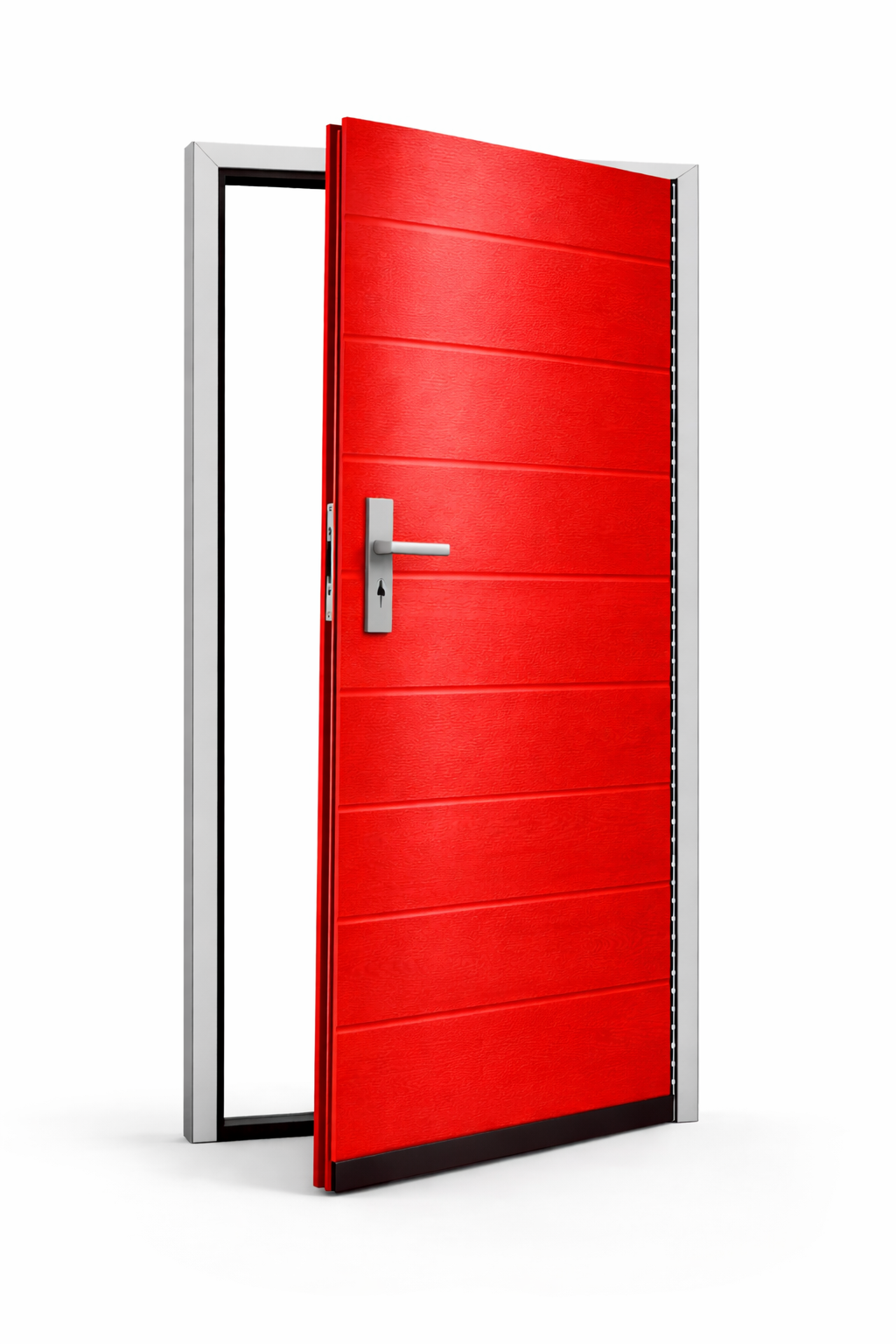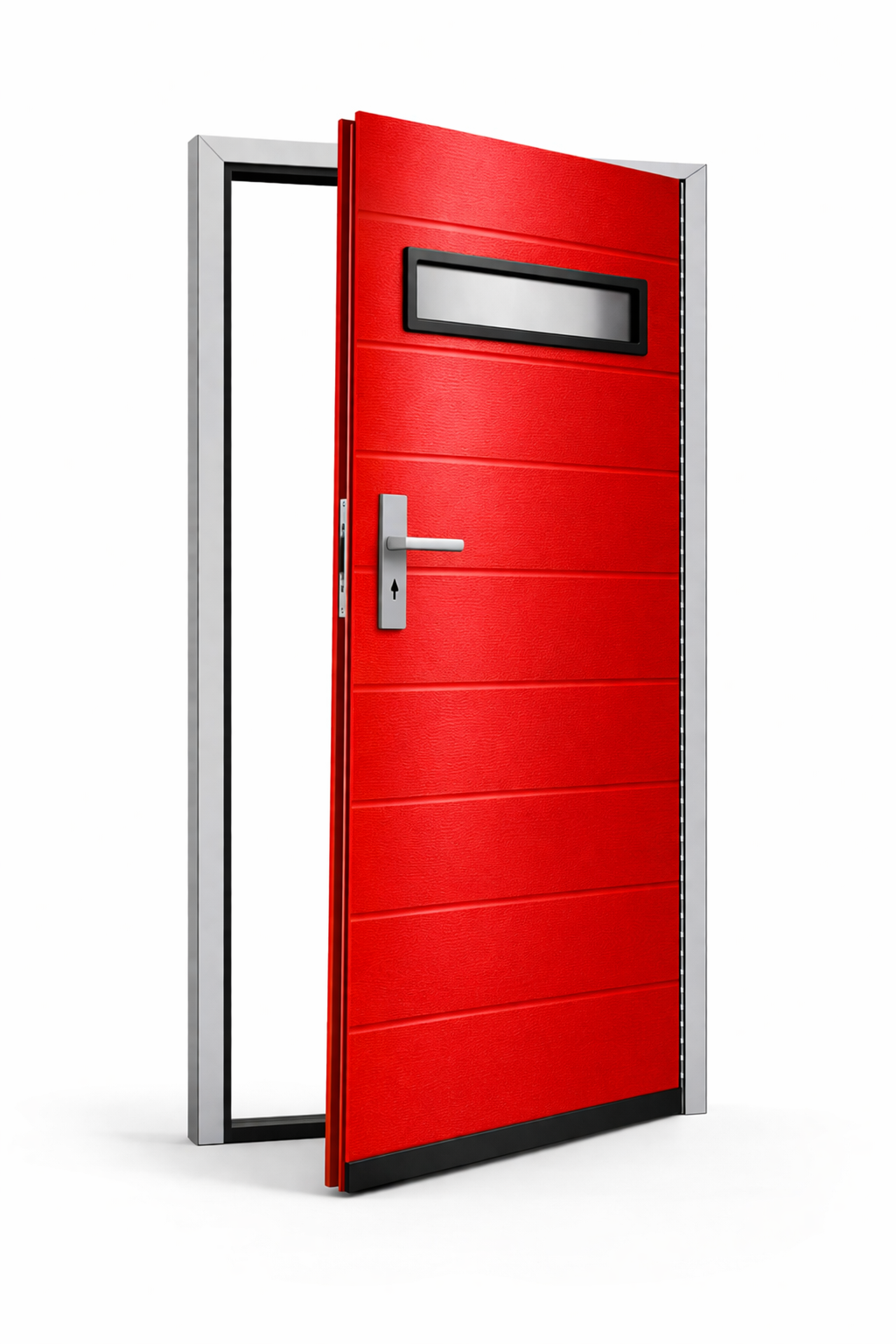 Konstrukcja drzwi oparta jest na aluminiowej ramie wzmacnianej stalą, co zapewnia wysoką trwałość, stabilność oraz odporność na odkształcenia. Dzięki temu drzwi sprawdzają się w intensywnym użytkowaniu oraz w wymagających warunkach zewnętrznych.