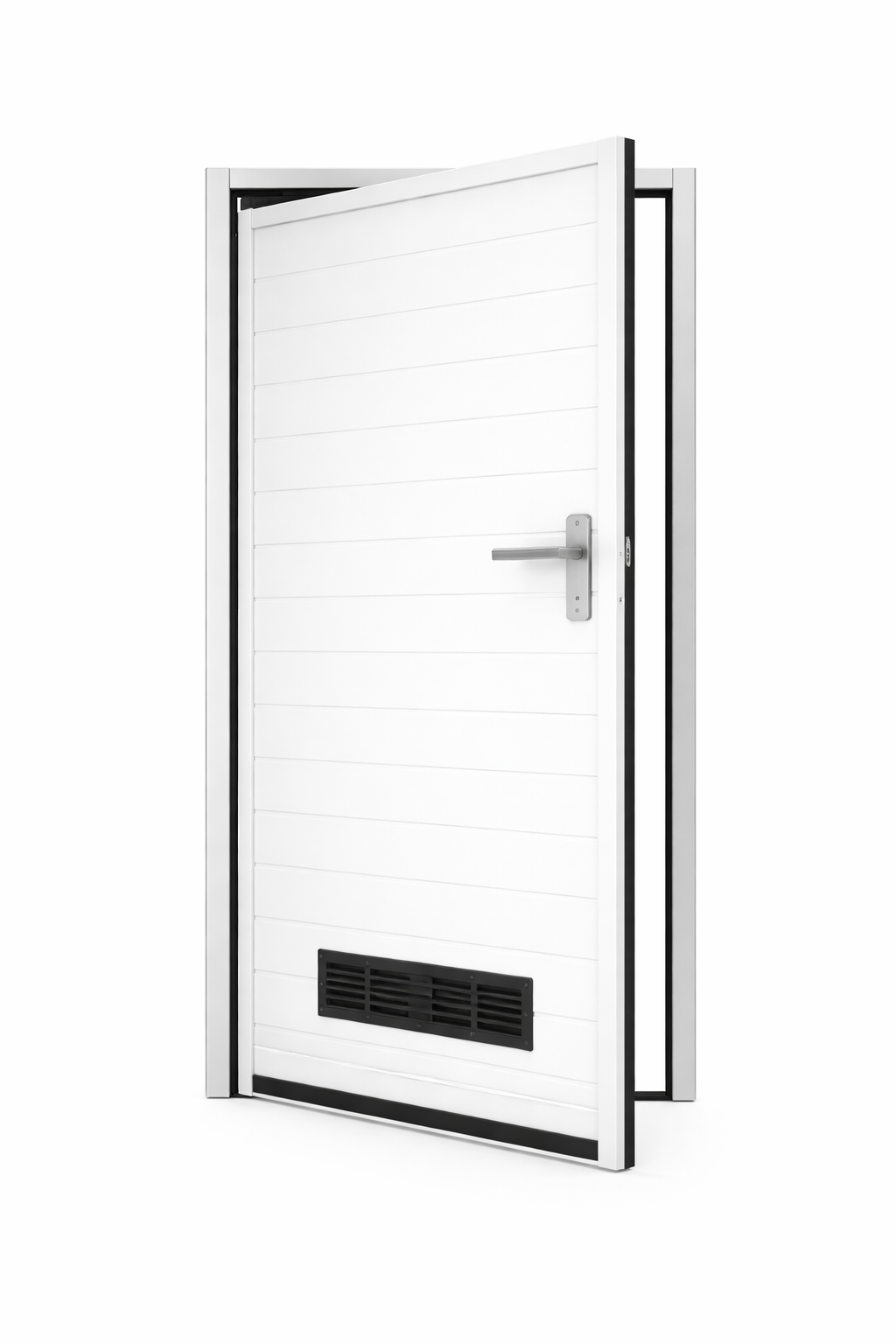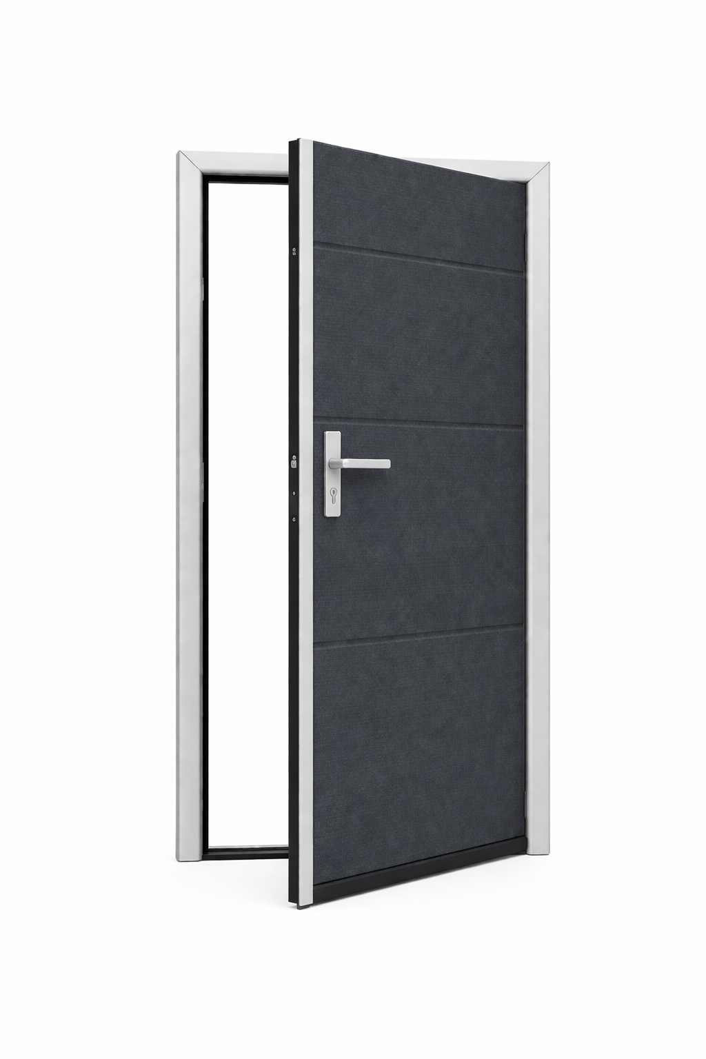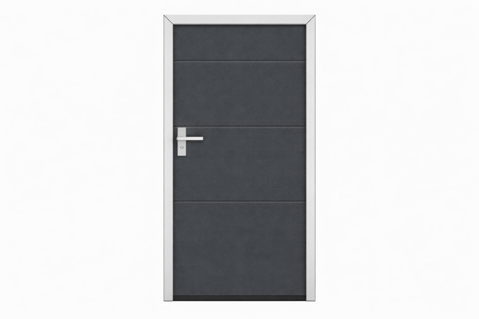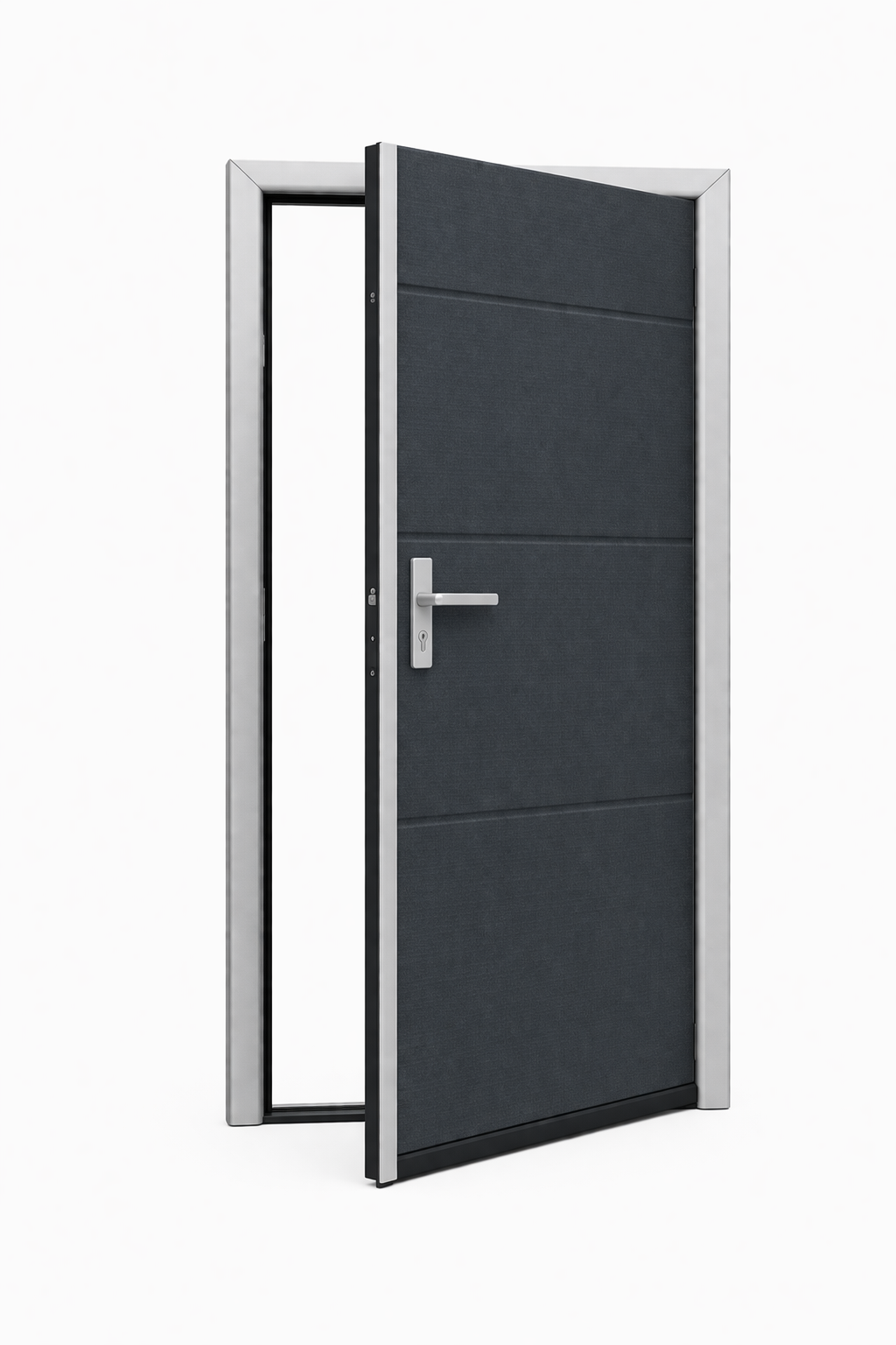 Drzwi wykonane z profili aluminiowych, ościeżnica wzmocniona profilami stalowymi. Panel drzwiowy ocieplony pianką poliuretanową 40mm.
