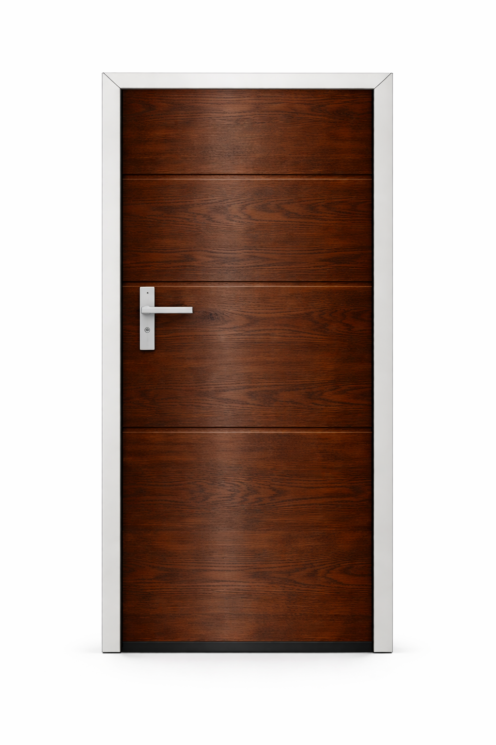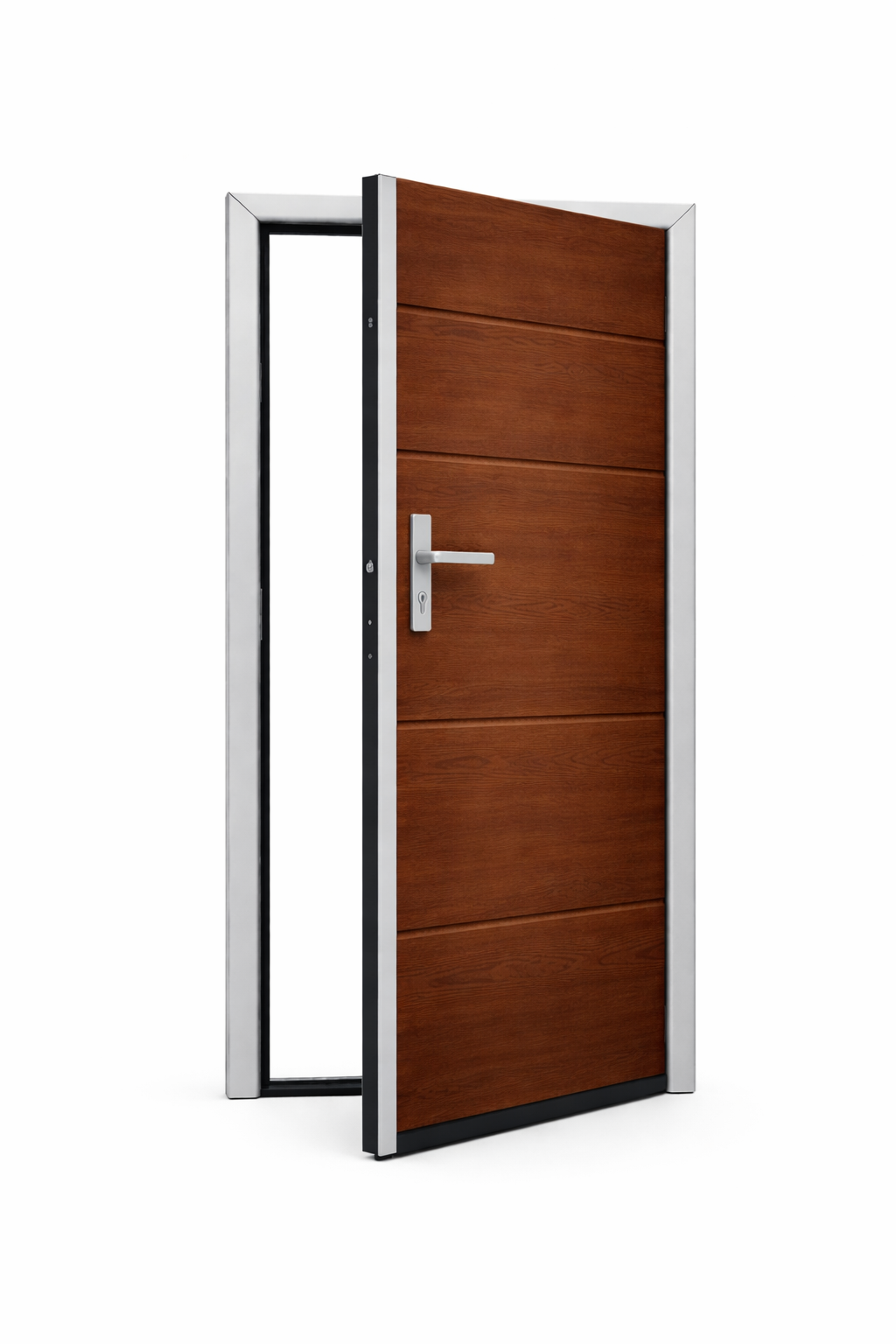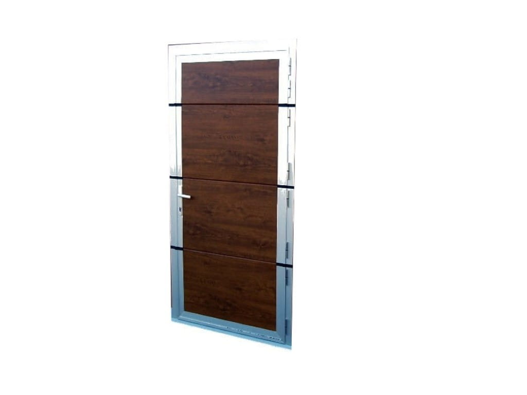 Drzwi wykonane z profili aluminiowych, ościeżnica wzmocniona profilami stalowymi. Panel drzwiowy ocieplony pianką poliuretanową 40mm.
