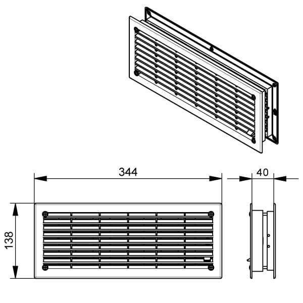 Kratka wentylacyjna czarna zasuwana.Przeznaczona do paneli o grubości 40mm.Wymiar Kratki 344mm x 138mm.