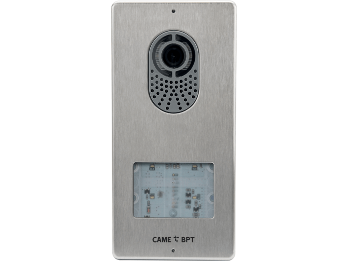 Panel wejściowy wideodomofonu, monolityczny, dla systemu X1, z możliwością rozszerzenia do 4 wywołań Wykończenie ze stali nierdzewnej szczotkowanej AISI 316L. Wyposażony w czujnik kamery NTSC/PAL rozdzielczości 680 x 512, z wbudowanym mikroprocesorem do cyfrowego przetwarzania sygnału. Układ optyczny „wide eye“, kąt widzenia poziomy 94° i pionowy 77°, z regulacją cyfrową zoomu. Umożliwia regulację głośności mikrofonu i głośnika oraz czasu aktywacji zamka elektrycznego.