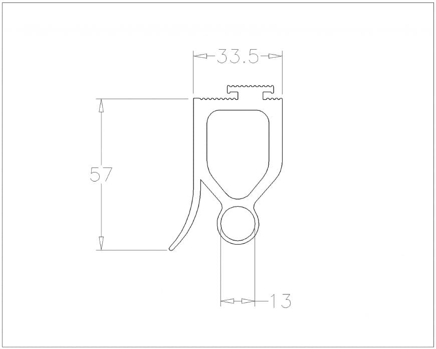 Podwyższony dolny profil gumowy umożliwiający montaż optosensorów. Wysokość profila podlega wymaganiom CE-ITTR zależnymi od szybkości ruchu bramy i poziomu siły zamykania. Stosuje się z różnymi profilami aluminiowymi. Dodatkowa warga docieplająca. Elastyczna i odporna na obciążenia. Wysokość uszczelki 57mm.
